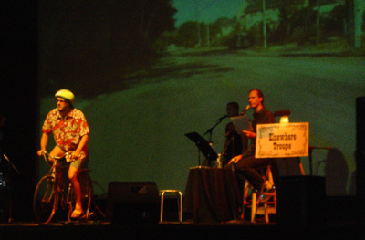 The Elsewhere Troupe producing my piece only had ten minutes of it worked out; they performed that as part of the Keep Santa Cruz Weird Festival, which was a variety show of different acts in the funky old Rio Theater (a repurposed movie theater) in Santa Cruz that we always pass on the way to the beach. They bill also featured a ukulele band called the UkeAholics, a juggler, a cowboy psychedelic story-teller, a pretty girl carrying title cards, a woman singing rap and opera, experimental movies, and more. Naturally the one act that was so weird that it left the audience temporarily speechless was mine. I’ve seen that effect so often, the stunned silence when my presentation stops. And to me what I’m offering always seems so clear and logical, a gentle extrapolation from familiar facts. In any case, it was great seeing the show, it’s a trip to see my personal psychic states being publicly dramatized.