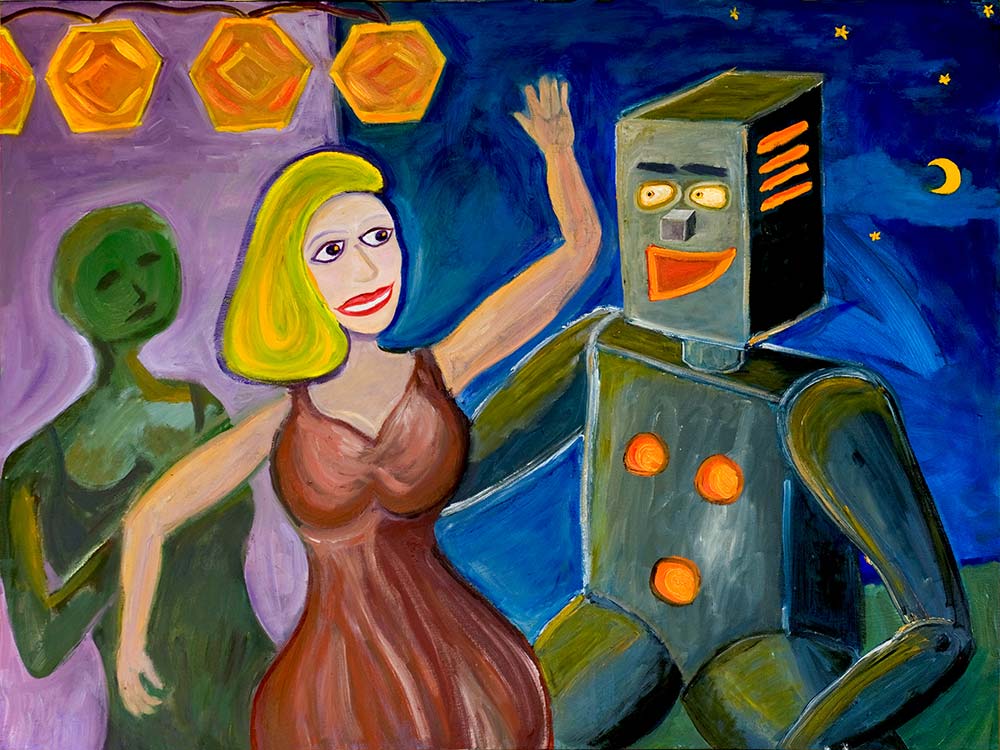 I finished a new painting today, “The Riviera.” I was going for a kind of French Impressionist look with this one, thinking of a garden party. Another inspiration was that I’d recently seen the Mel Brooks theater production of Young Frankenstein. But I went for a robot or mechanical man rather than a Frankenstein’s monster. I like how he’s glowing from the inside. In a way, this painting is an image of my wife Sylvia and me, on a car-trip we took to the Riviera with her brother Henry, in 1966, the year before Sylvia and I were married.