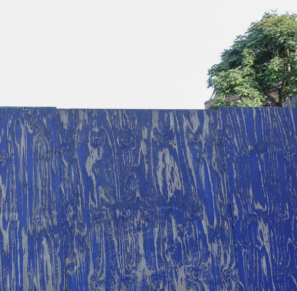 Nice blue-painted plywood wall closing off a yard or something. The paint worn in a nice way. I like how natural patterns don’t repeat.
