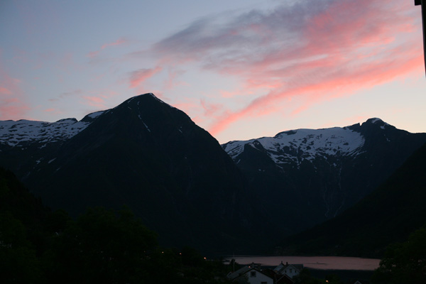 A baby in a carriage beside me is topped by the mound of a cotton-covered feather-bed comforter. All of the beds here have these fat comforters and no top-sheets or blankets. Given the unusual heat during our stay—70 or even 80 Fahrenheit—we’re hot at night, steaming in the midnight sun. Last night I saw the sunrise at 2 a.m. They have posters around town that mention the latitude—I think it’s 62 degrees.