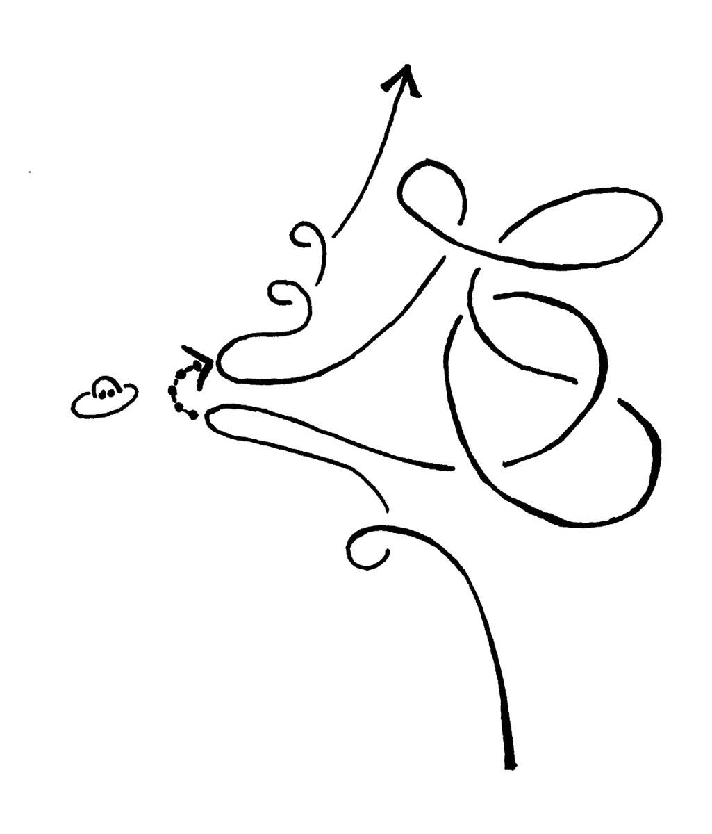The sensations generated by the drop’s motions extend beyond sight and into touch and sound; Frank can feel and hear them. The touch-sensation of the drop’s motions is as the caresses of a fitful zephyr that’s patterning the air with hollows and whorls.