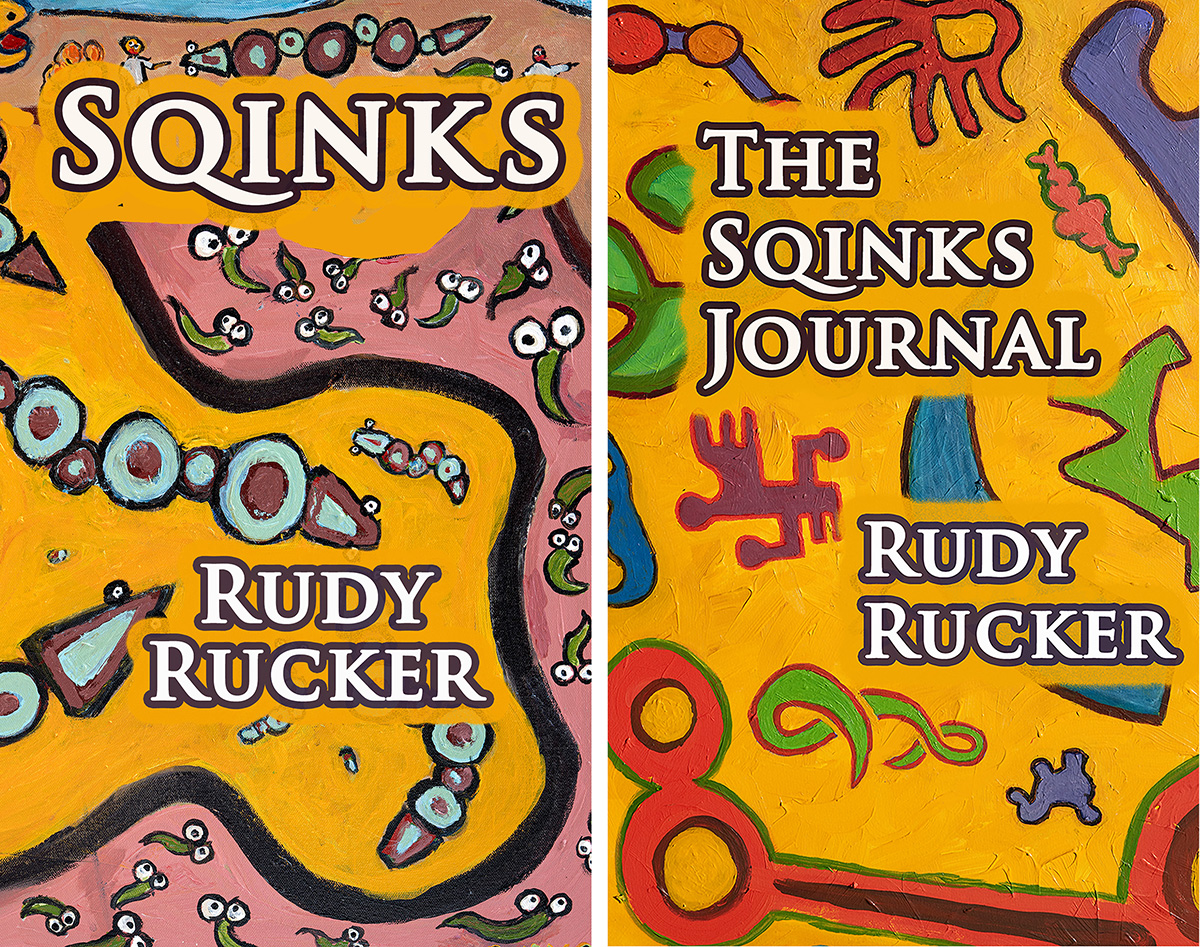 Sqinks is a visionary tale of aliens in today's San Francisco. The sqinks. In some ways they're like our new AIs. But in other ways, they're a thing nobody's ever seen. Nobody except Rudy. And, um, these aliens seem to have an interest in replacing human brains. It's a surreal rollercoaster, rich with ideas, scares, and laughs.